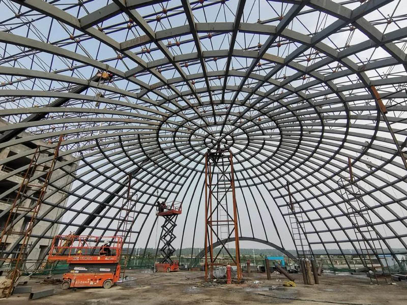 吉利飛行汽車(chē)項(xiàng)目汽車(chē)展廳鋼結(jié)構(gòu)工程,主體是直徑32米的橢圓形空間桁架結(jié)構(gòu),本工程加工工藝復(fù)雜,構(gòu)件數(shù)量多且雜,車(chē)間及現(xiàn)場(chǎng)焊接工作大,主構(gòu)件對(duì)接焊接均要求一級(jí)焊縫,施工期間兩臺(tái)全站儀同時(shí)不同角度測(cè)量,配合臨時(shí)支撐架現(xiàn)場(chǎng)有序、施工,整體工期45天。